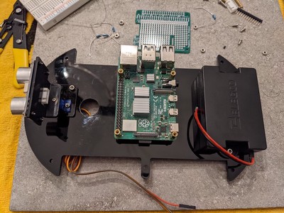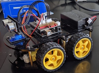 The pan and tilt HAT went on last. Below is the car fully assembled, complete with a camera and power supply.